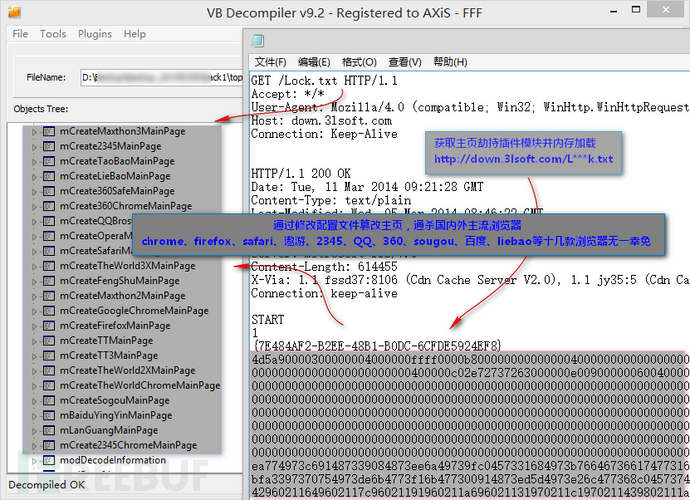 下面讲到的案例是我们曾经捕获到的一批导航主页劫持样本,历史活跃期最早可以追溯到2014年,主要通过多类流氓软件捆绑传播,其劫持功能模块通过联网更新获取,经过多层的内存解密后再动态加载。其中的主页劫持插件模块通过修改浏览器配置文件实现主页篡改,对国内外的chrome、火狐、safari、傲游、qq、360、搜狗等20余款主流浏览器做到了全部覆盖。实现这些功能显然需要对这批浏览器的配置文件格式和加密算法做逆向分析,在样本分析过程中我们甚至发现其利用某漏洞绕过了其中2款浏览器的主页保护功能,流氓作者可谓非常“走心”,可惜是剑走偏锋。