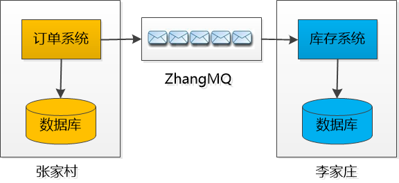 “就拿你遇到的情况来说吧, 我们开发一个消息队列,名称我都想好了,就叫ZhangMQ(Zhang Message Queue), 把它部署在我们张家村和李家庄之间, 我们村产生的订单, 你只要负责把订单消息写到这个队列里就完事大吉了。 ”